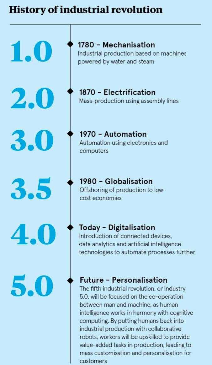 Cuộc cách mạng công nghiệp lần thứ năm, hay Công nghiệp 5.0, sẽ tập trung vào sự “hợp tác” giữa con người và máy móc, vì trí thông minh của con người hoạt động hài hòa với “điện toán nhận thức”. Bằng cách đưa con người trở lại sản xuất công nghiệp với sự phối hợp của robot, người công nhân sẽ được nâng cao kĩ năng để cung cấp các giá trị gia tăng trong sản xuất, dẫn đến TUỲ BIẾN VÀ CÁ NHÂN HOÁ SẢN XUẤT SẢN PHẨM HÀNG cho khách hàng.
